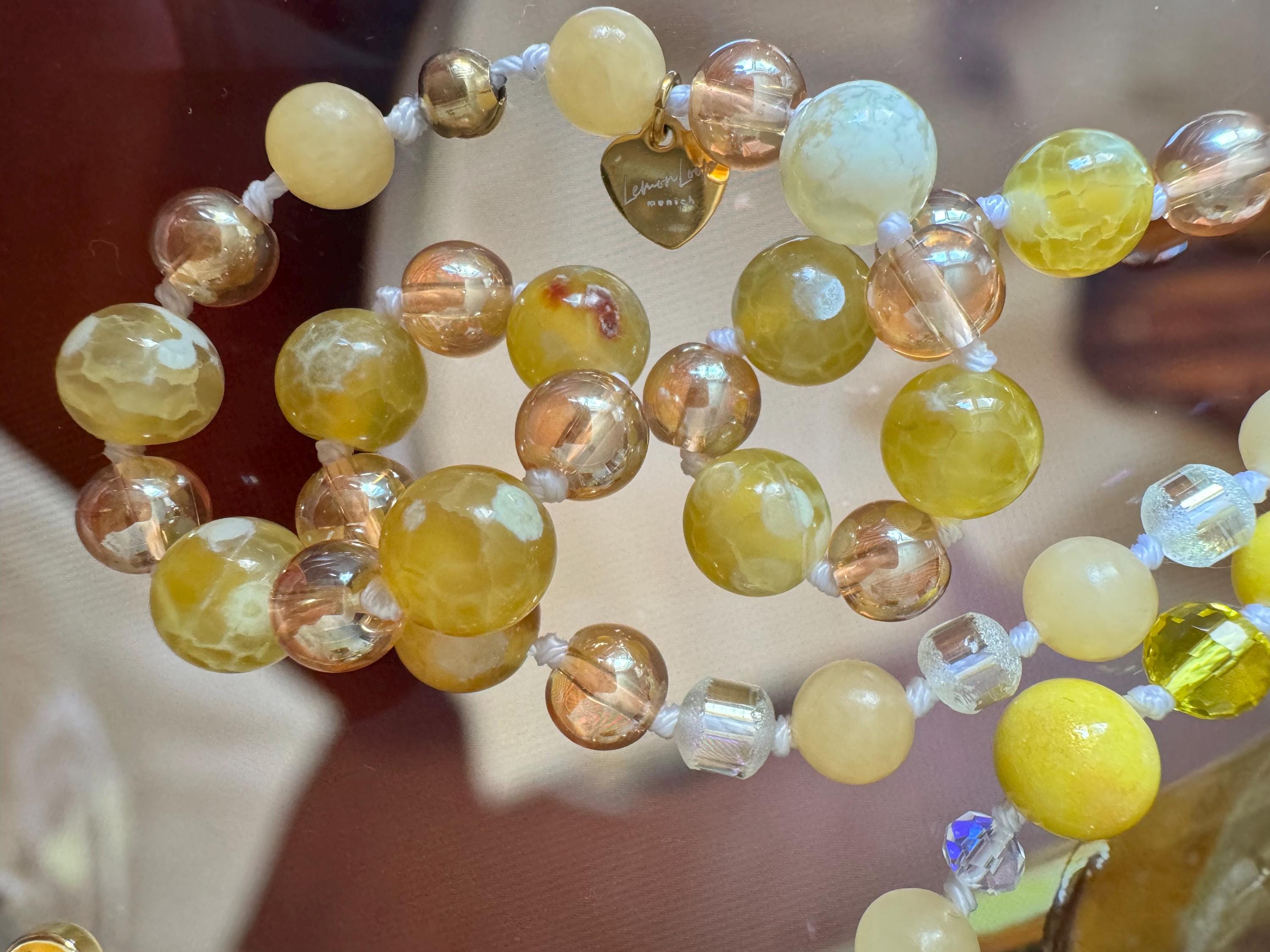Semi-precious stone pearl necklace tourmaline jade freshwater pearl, individually knotted with a beautiful CROSS. Sun yellow citrine agates and fire agates give the power and protection of the earth.